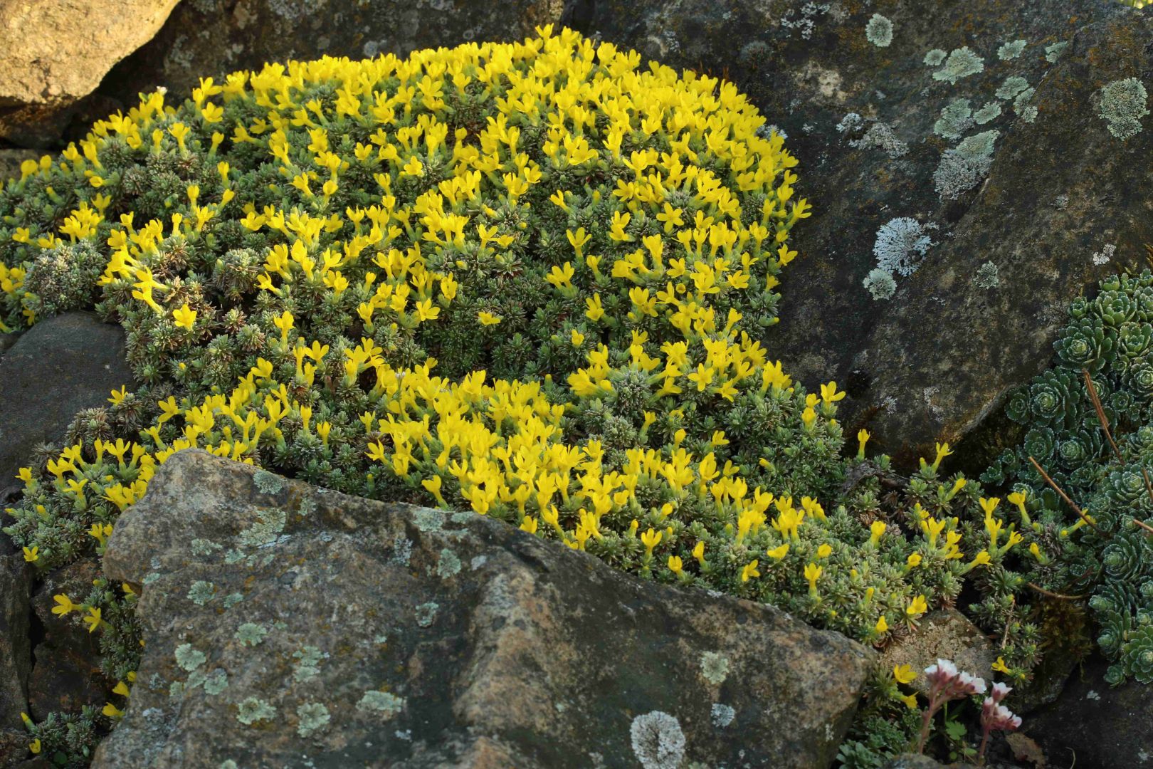 Vitaliana primuliflora je často pěstována pod synonymem Douglasia vitaliana. Patří do čeledi Primulacea a je velice podobná pochybkům Androsace, však také jedno z jejich synonym je Androsace vitaliana. Pochází z hor střední a jihozápadní Evropy (setkali jsme se sní jak Alpách tak v Pyrenejích). Vzhledem k jejím odlišnostem na různých lokalitách byla rozdělena do několika subspecií (např subsp.praetutiana, susbp.cinerea....). V přírodě roste v sutích a skalních štěrbinách a dává přednost vápencovému podkladu. Je to nízká trsnatá rostlina s kopinatými do 15mm dlouhými stříbrnými až zelenými listy. Dosahuje výšky max.5cm. Některé subspecie se pomalu rozrůstají do stěsnaného koberečku např.subsp.praetutiana. Kvete žlutými drobnými květy. Dříve jsme tento druh pěstovali na plném slunci, ale zdá se nám, že odklon i mírný polostín jí vyhovuje lépe. Na půdu není nijak náročná, roste dobře jak na kyselu tak na vápenci. Množíme ji výsevem ihned po sebrání semen a řízkováním. Je to vděčná a dlouhověká skalnička.